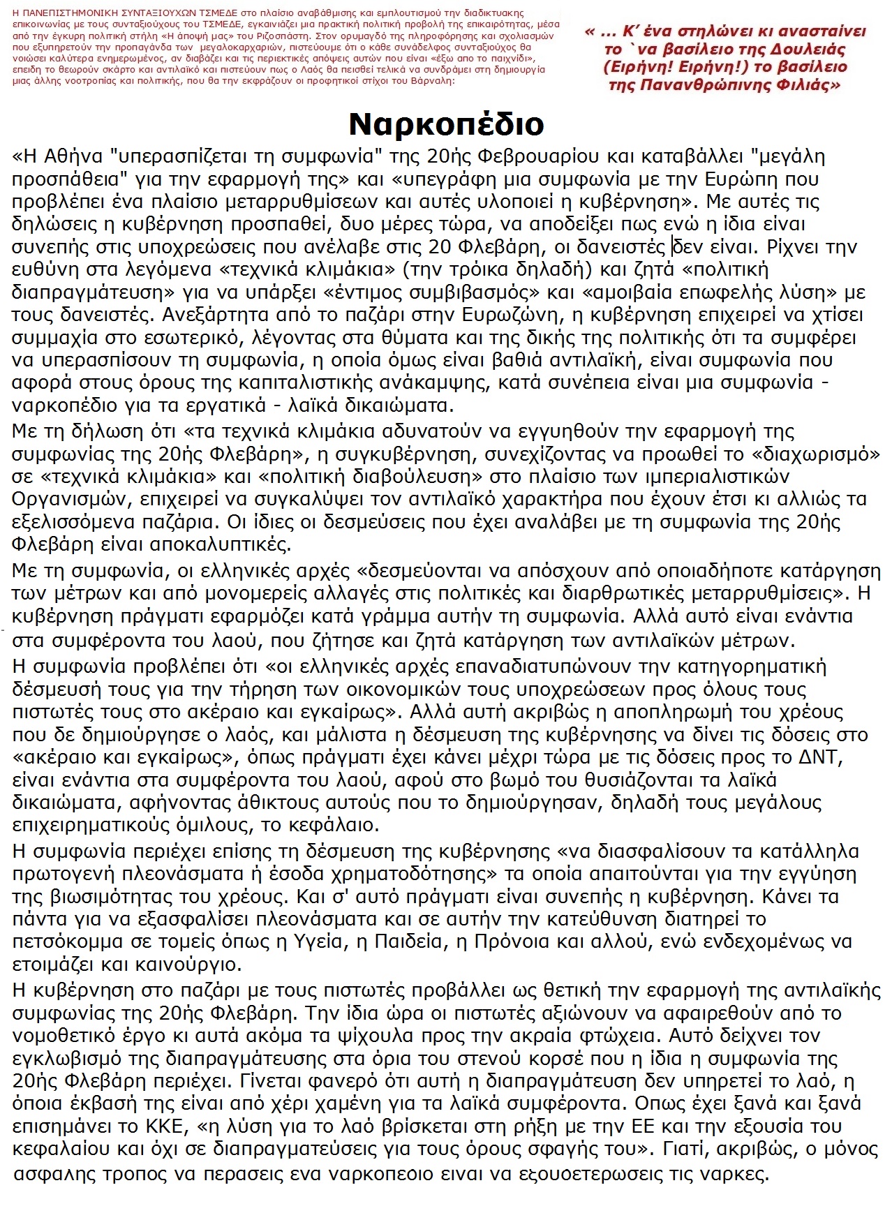 ΠΑΝΕΠΙΣΤΗΜΟΝΙΚΗ-ΕΠΙΚΑΙΡΟΤΗΤΑ: Ν α ρ κ ο π έ δ ι ο ————– …Ανεξάρτητα από το παζάρι στην Ευρωζώνη, η κυβέρνηση επιχειρεί να χτίσει συμμαχία στο εσωτερικό, λέγοντας στα θύματα και της δικής της πολιτικής ότι τα συμφέρει να υπερασπίσουν τη συμφωνία, η οποία όμως είναι βαθιά αντιλαϊκή, είναι συμφωνία που αφορά στους όρους της καπιταλιστικής ανάκαμψης, κατά συνέπεια είναι μια συμφωνία – ναρκοπέδιο για τα εργατικά – λαϊκά δικαιώματα…